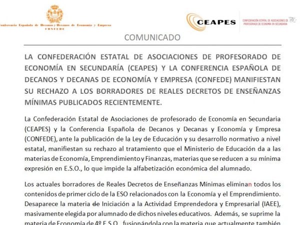 Por todo lo anterior, es necesario que las propuestas y alegaciones que han sido presentadas por CEAPES, avaladas por la CONFEDE y las distintas Asociaciones del colectivo de profesores de Economía que lo representan, sean tenidas en cuenta, potenciando el desarrollo de las materias de contenido económico, financiero y de emprendimiento en todos los niveles educativos de la Educación Secundaria, impartidas por profesorado especialista, formación que cualquier sociedad moderna en el actual contexto nacional e internacional precisa.